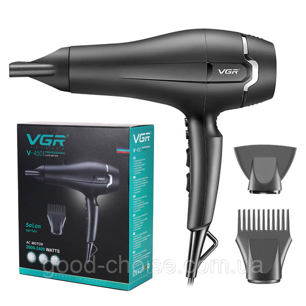 Фен для волосся + 2 насадки, від мережі, 2400Вт, VGR V-450 / Професійний фен для сушки волосся